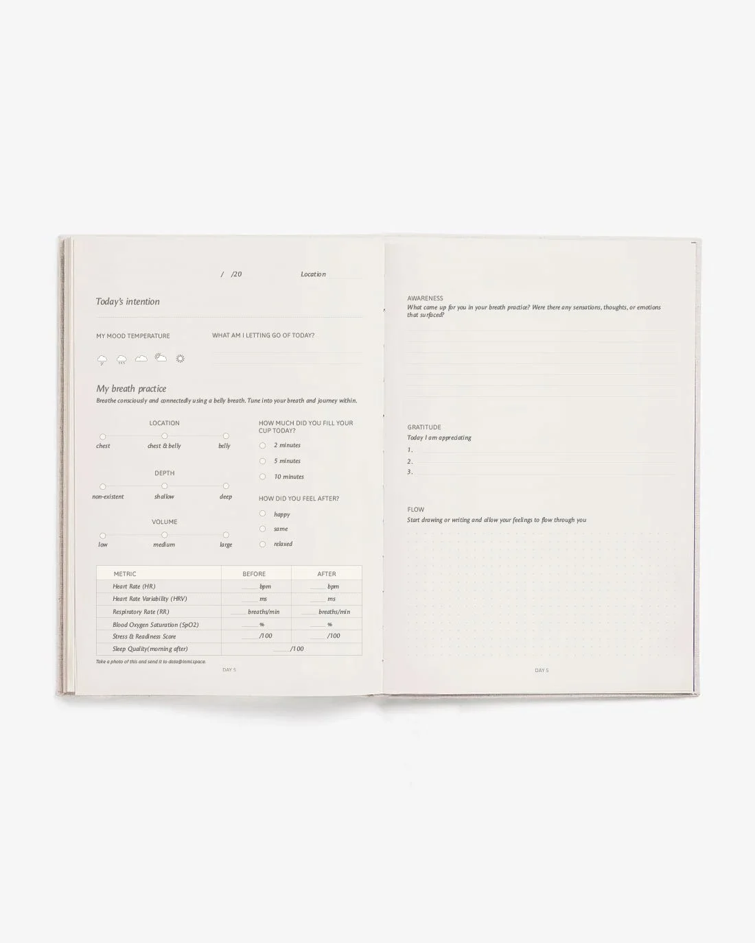 A guided breathwork journal with 90 daily prompts, reflections, and videos to help you cultivate calm, presence, and self-trust.